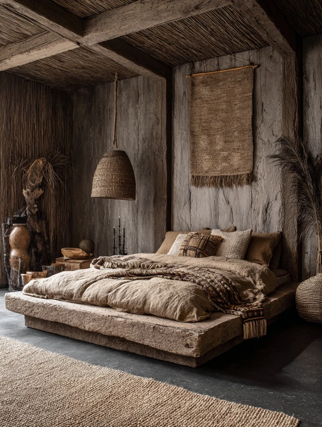 Linen sheets, woven rugs, wicker baskets, and wooden floors.