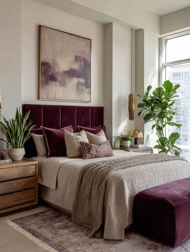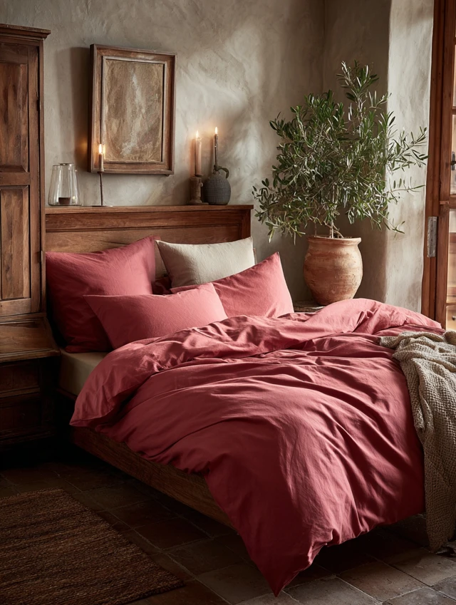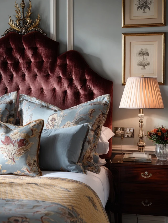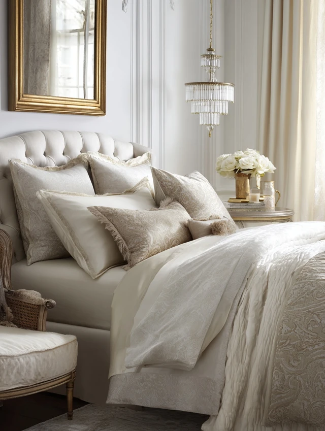 Layer textures like silk pillowcases, velvet throws, and linen shams for depth.