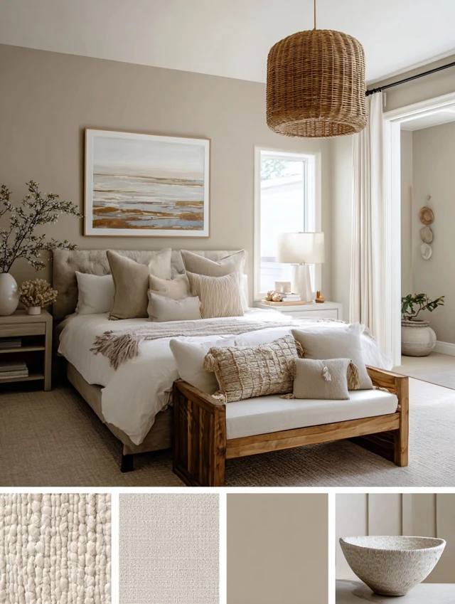- Cream + taupe + warm wood