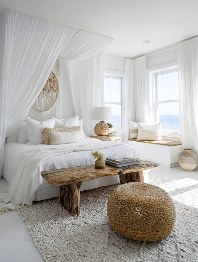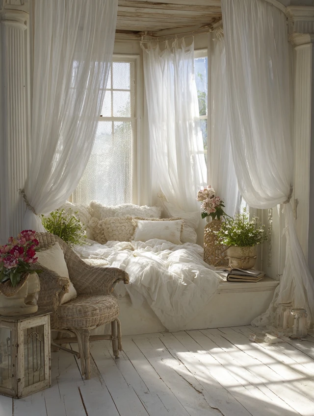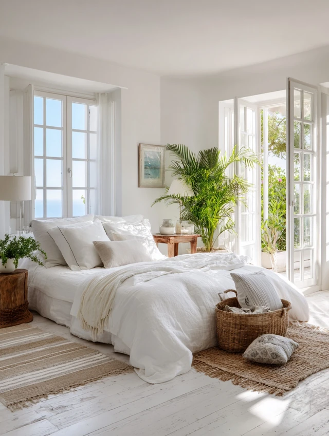 Sheer or linen white curtains allow natural light to flow gently into the room.