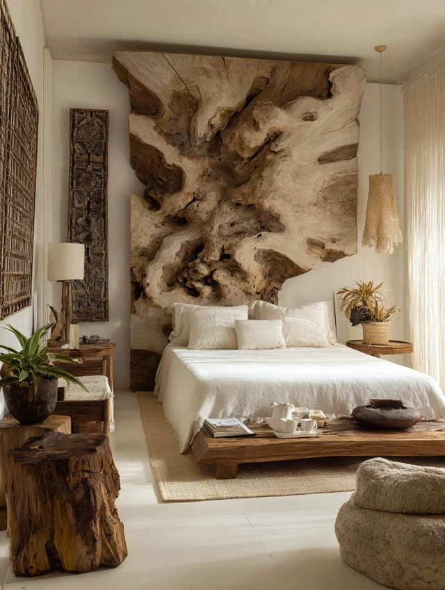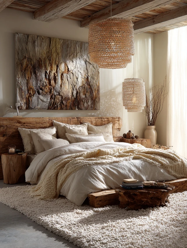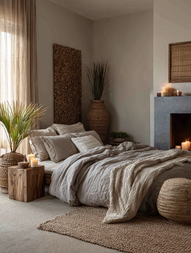 Bamboo rugs, linen sheets, cotton throws, wooden furniture, and stone accents.
